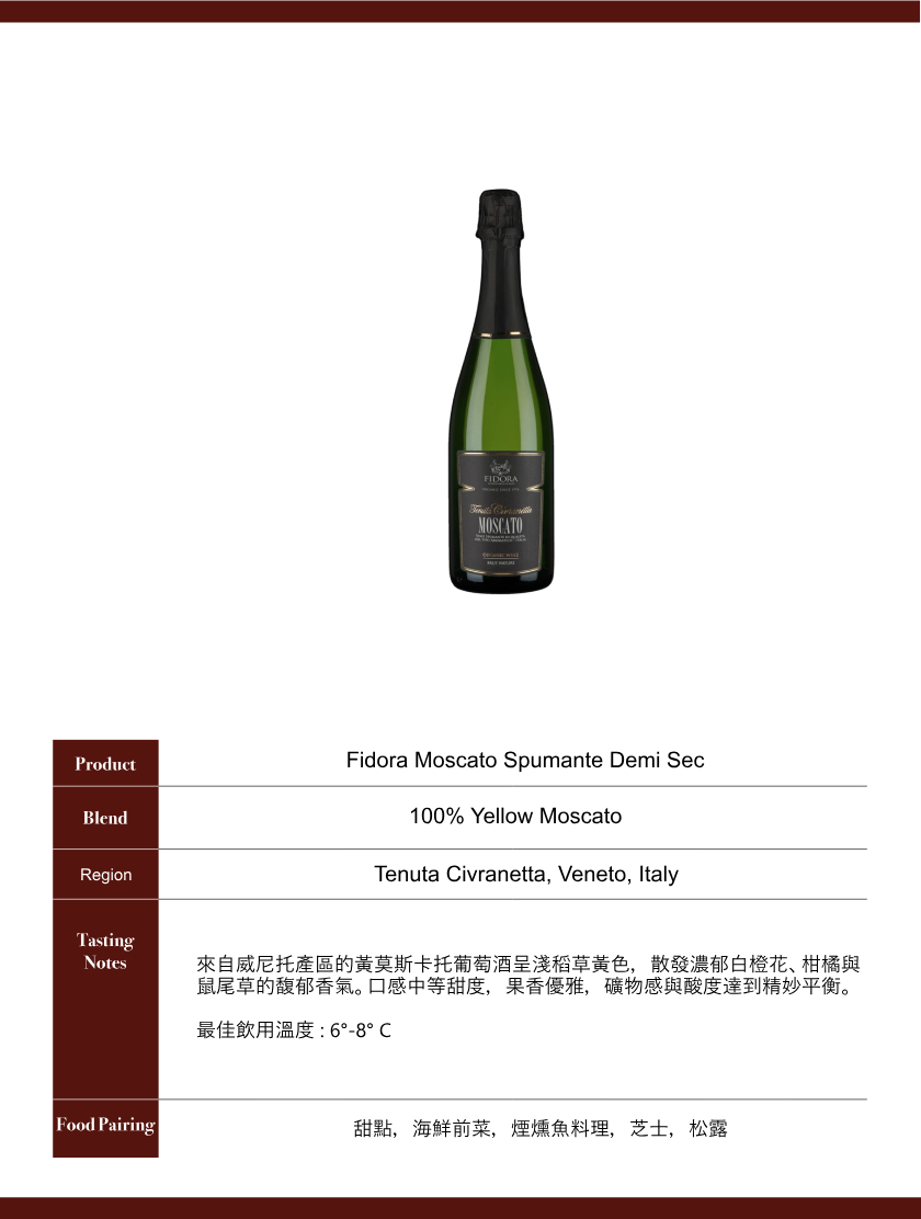 來自威尼托產區的黃莫斯卡托葡萄酒呈淺稻草黃色,散發濃郁白橙花、柑橘與鼠尾草的馥郁香氣。口感中等甜度,果香優雅,礦物感與酸度達到精妙平衡。