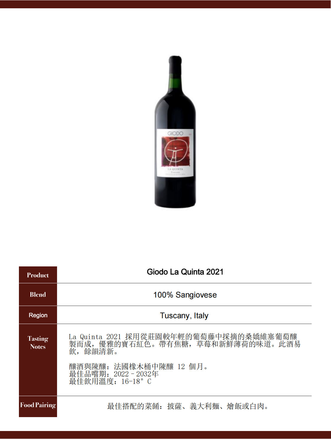 La Quinta 2021 採用從莊園較年輕的葡萄藤中採摘的桑嬌維塞葡萄釀製而成,優雅的寶石紅色。帶有焦糖,草莓和新鮮薄荷的味道。此酒易飲,餘韻清新。