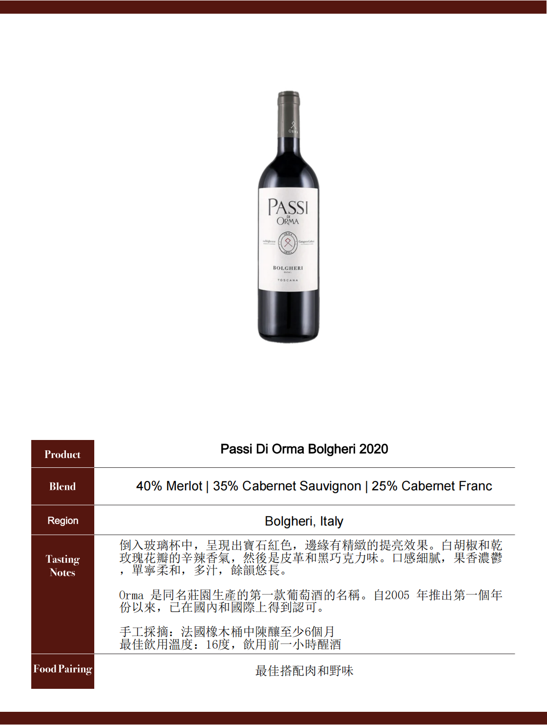 Orma 是同名莊園生產的第一款葡萄酒的名稱。自2005 年推出第一個年份以來,已在國內和國際上得到認可。