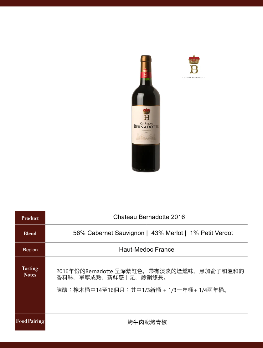 2016年份的Bernadotte 呈深紫紅色,帶有淡淡的煙燻味,黑加侖子和溫和的香料味,單寧成熟,新鮮感十足,餘韻悠長。